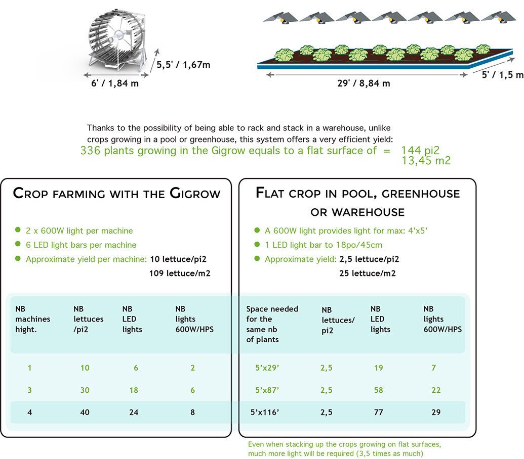 If we roll out the circle of 336 plants of the Gigrow system, we can appreciate a HUGE saving of space and light. Indeed, to allow the same amount of plants to grow on a flat surface like a NFT crop, in a pool or in a greenhouse, it takes about 3,5 times as much light and 4 times as much space!